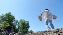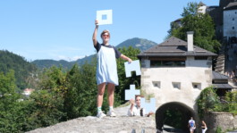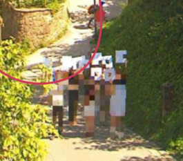 Every 10 minutes, a camera captures the situation on the hiking trail to Hohensalzburg Fortress. The panoramic image is made available to the public on a website. Additionally, a current image is transmitted to two screens at the valley station of the fortress railway. This allows visitors to check the weather before their trip, see how many people are in line, or get a real-time view of the fortress from anywhere in the world. The archive of panoramic images dates back to 2016. Since November 2023, people visible in the photos have been pixelated for privacy reasons. We are trying to trick the system. We’ve collected screenshots from the last 8 years, each taken on August 16th at 4:40 PM. From the shades of blue in the sky in these images, we have created an „average“ blue that combines the various sky tones. This blue also serves as a prediction for the sky’s shade on August 16th, 2024, at 4:40 PM, the moment when our live performance is happening. Over the course of an hour, we hold signs in this „average blue“ in front of the webcam. This will create 6 panoramic images in which we are visible with these signs. The software becomes confused: Where does the human body begin, which needs to be pixelated? It happened, that the sky blue pixels mix with those of our bodies. The performance will be viewable on the fortress railway webcam website for the next 10 years.